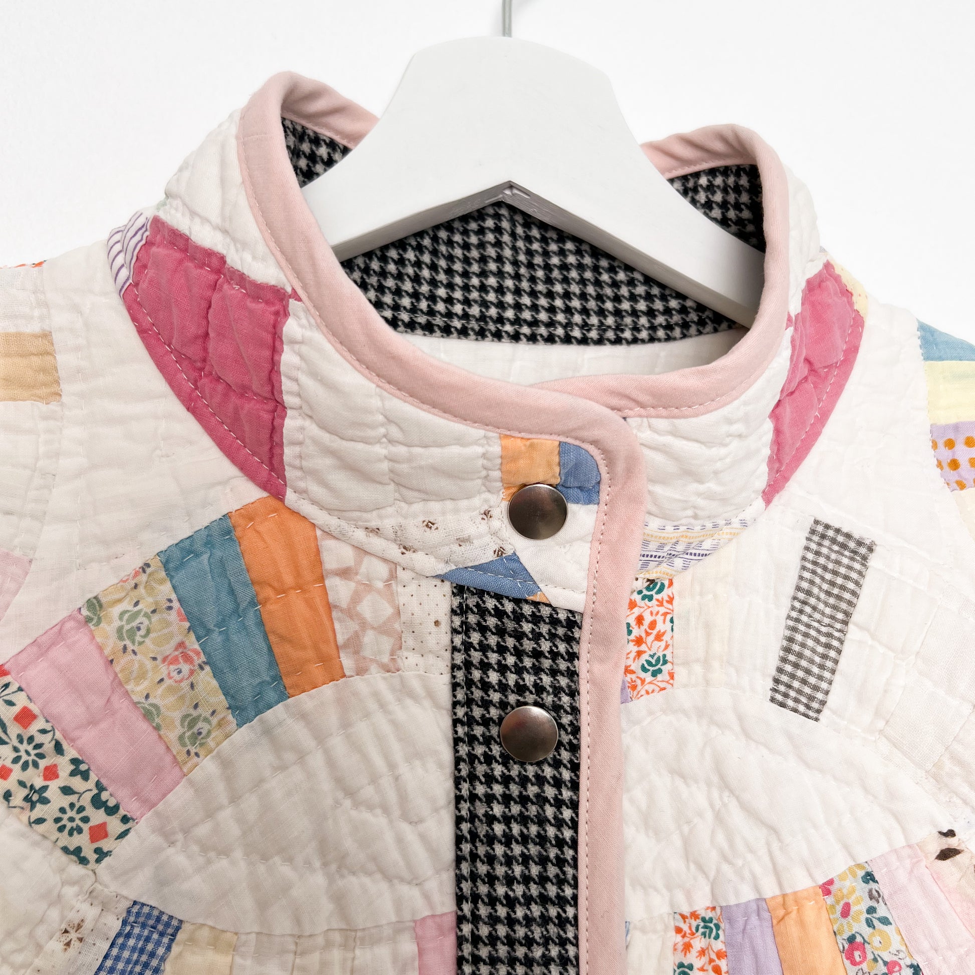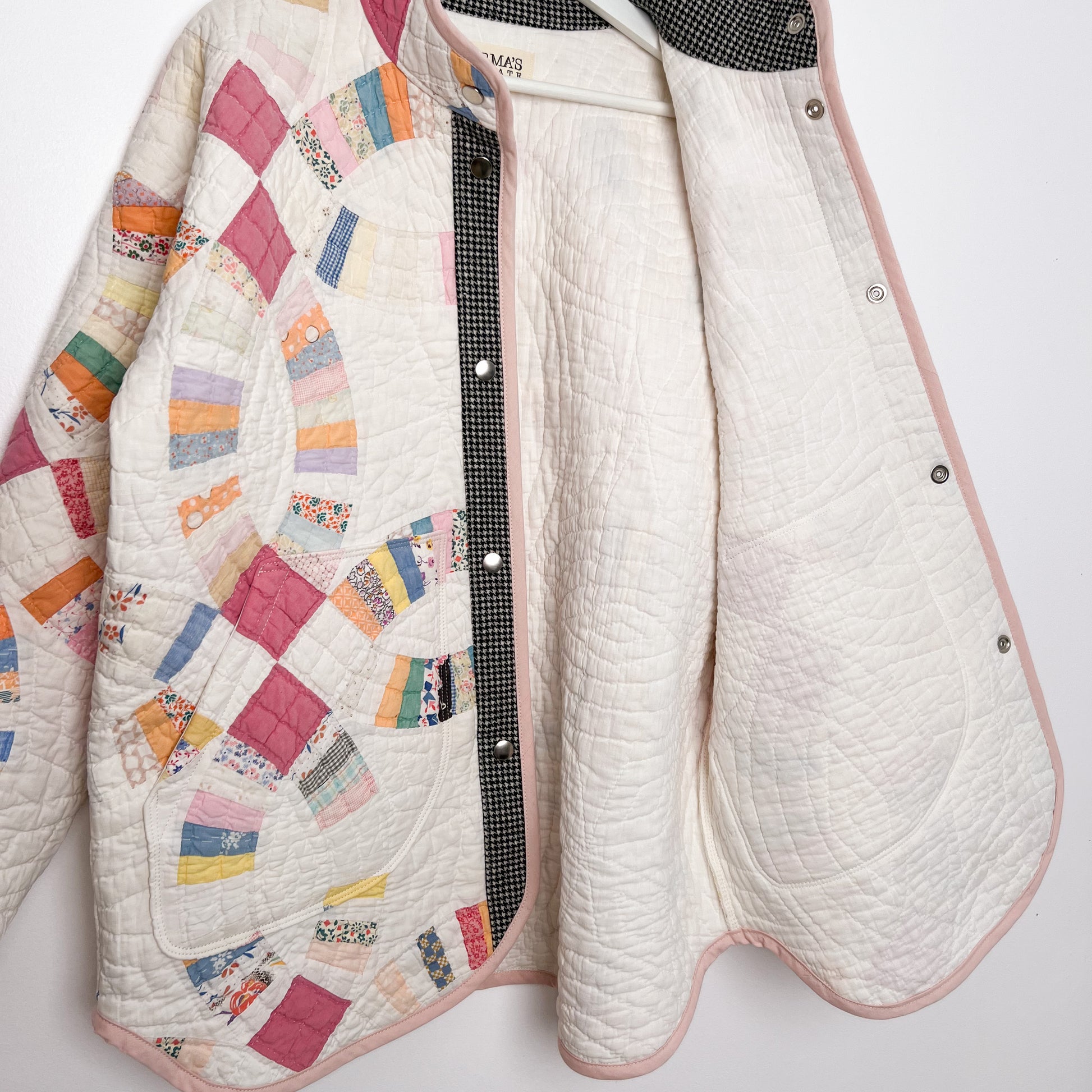 This jacket is made from a beautiful vintage hand-stitched hand-pieced double wedding ring quilt. Featuring 100% wool black and white houndstooth plackets and inside collar. Finished with light pink edge binding and white cotton pocket lining. There are two front pockets and silver tone snap closures. Medium weight. This is a lengthened version of flora jacket pattern.