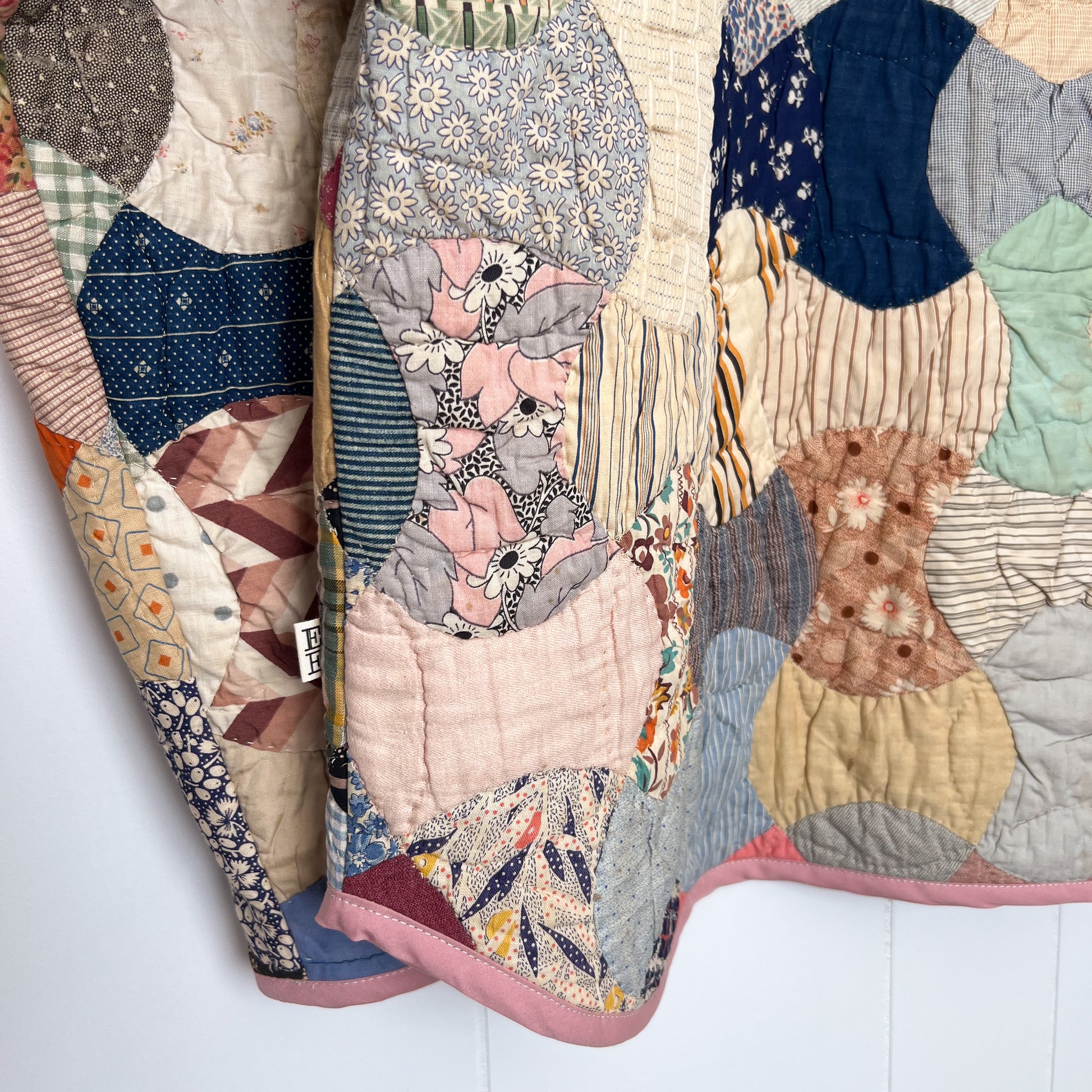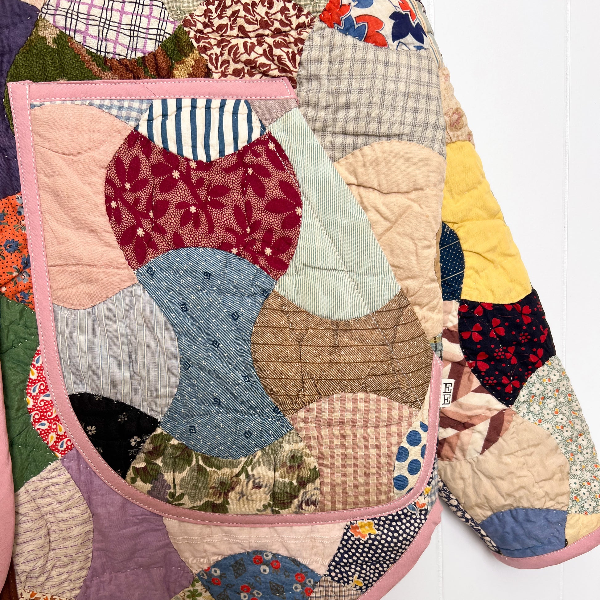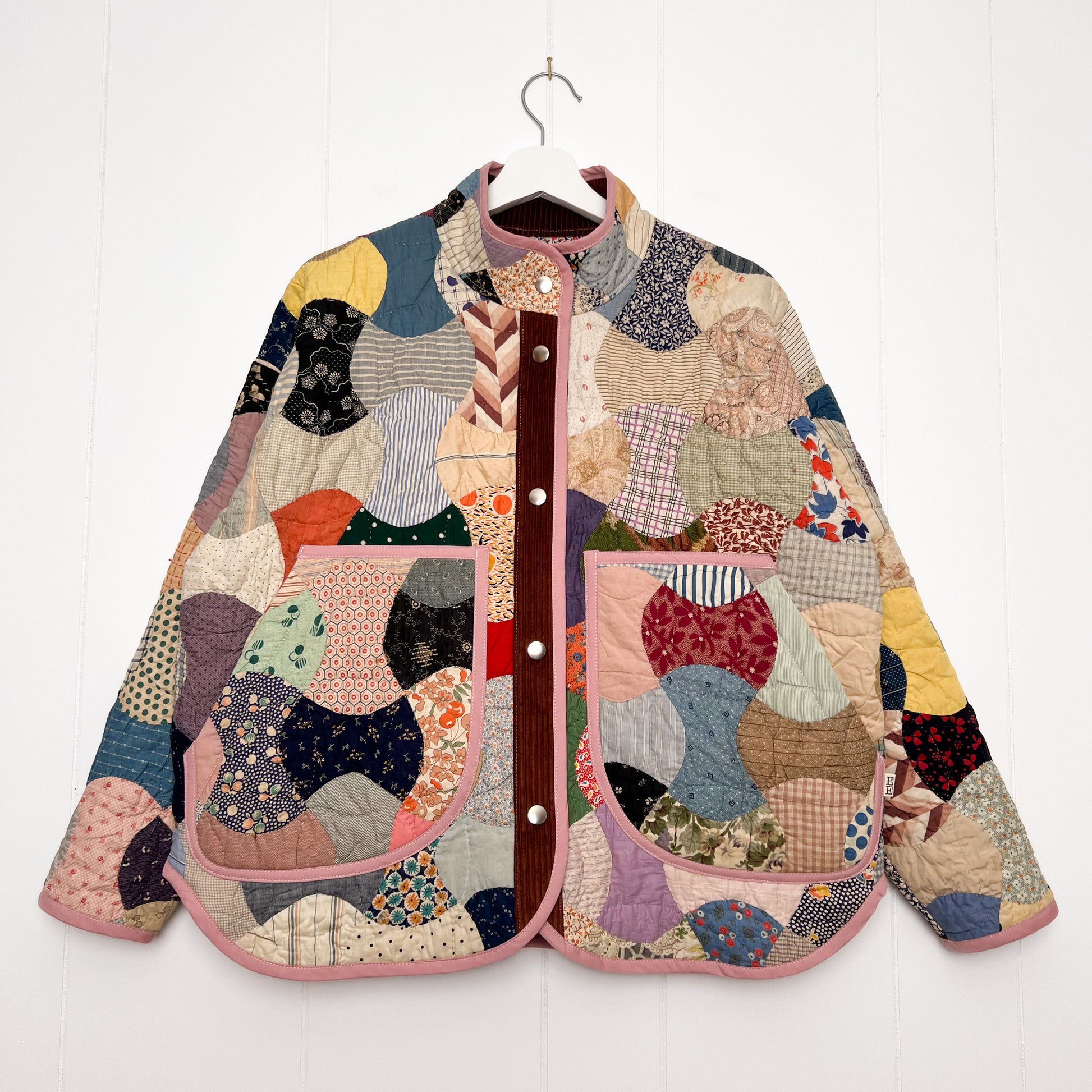 As this jacket is made from a vintage quilt, I mend or work around any significant damage on the quilt to ensure the longevity and visual aesthetic of the garment. However, it's in the nature of vintage quilts to show signs of age. Any signs of age on this jacket are intentional. These are not flaws; they bring beauty, character, and history to this item. I do my best to show all points of wear in the photos and description, but it's possible some minor ones may be missed. All fabric is prewashed. Please review all photos and measurements carefully before purchasing. ALL SALES ARE FINAL.