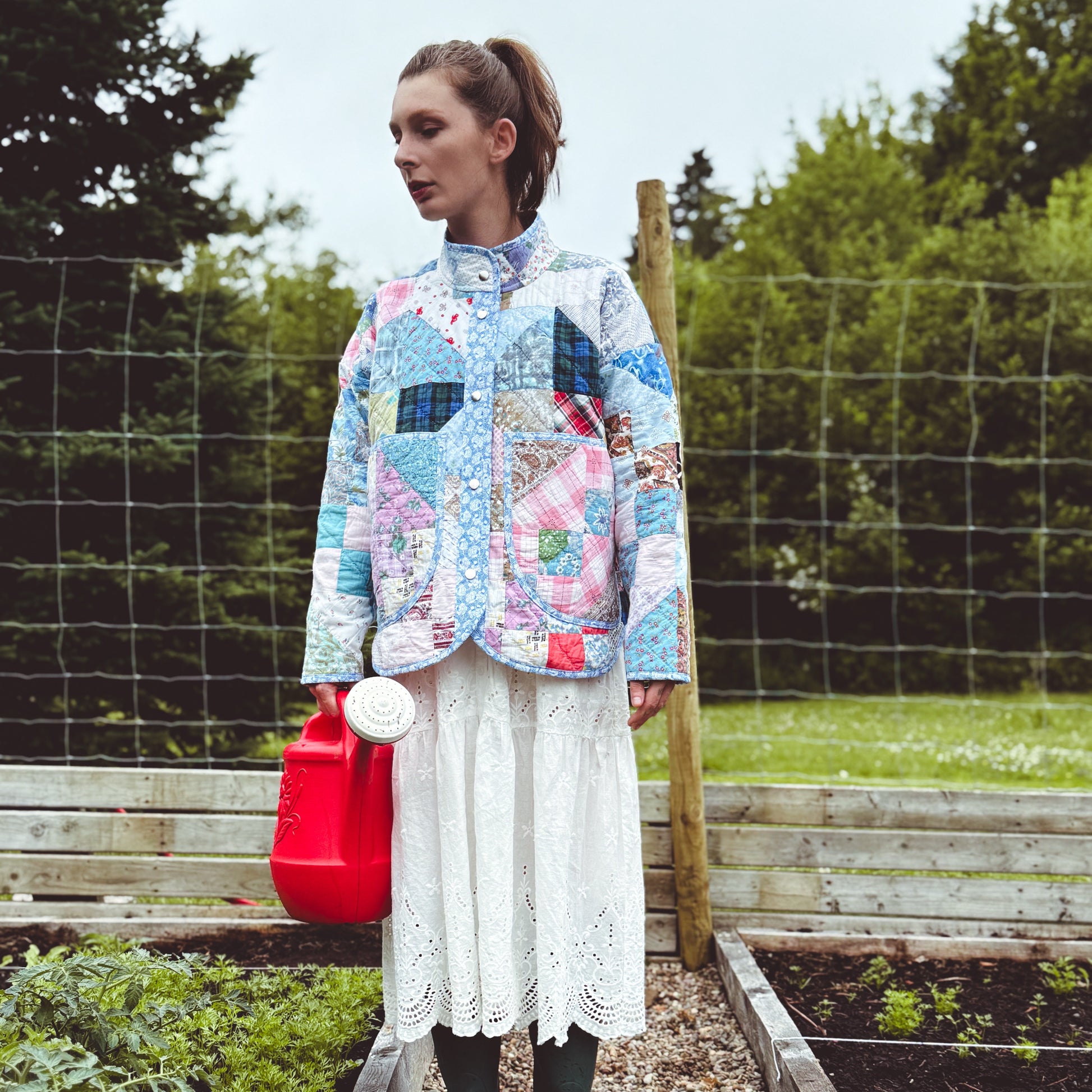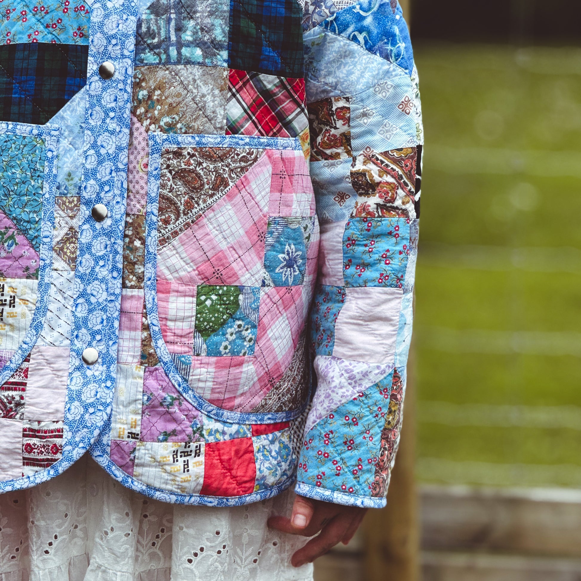 Made from a gorgeous vintage (50's era) hand stitched quilt with both 50's and 60's prints throughout. Featuring a beautiful 60's French deadstock cotton for edge binding, pocket lining, and front plackets. This jacket has two large front pockets, silver tone snap closures, and is the longer version of the popular Flora Jacket pattern. Light/medium weight.